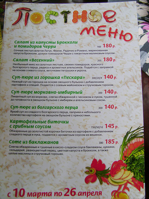 Обслуживание — как везде в этой сети. Если берешь «телегу» (так их шведский стол называется), то дают то ли две, то ли одну тарелку. Если хочешь сделать несколько подходов, то будешь с грязной тарелкой к «телеге» ходить. Если заказываешь по меню, то использованную посуду забирать с твоего столика особо не торопятся. Но вообще идут в ногу со временем — во время православных постов предлагают постное меню.