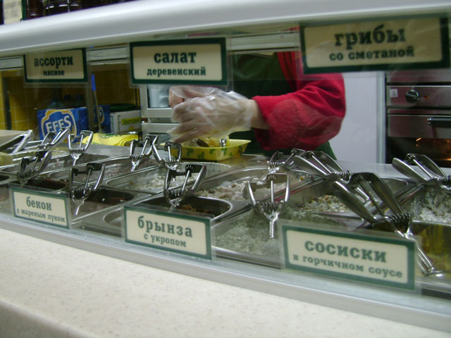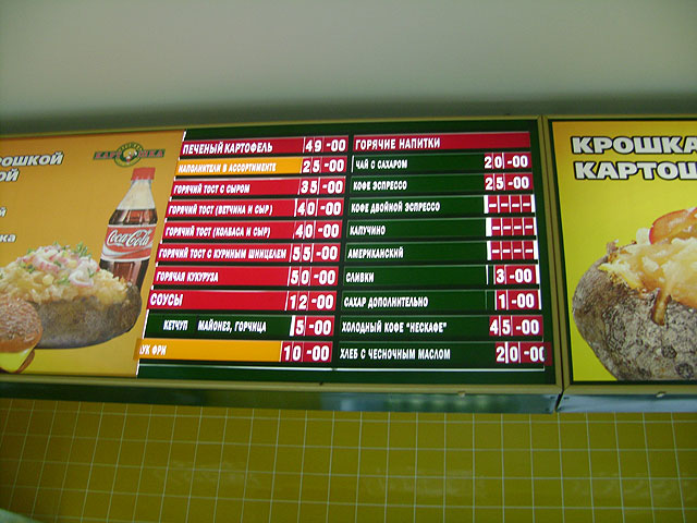 «Крошка-картошка» — одна из крупнейших сетей быстрого питания в России. Основное блюдо — запеченный в фольге картофель, к которому вы можете взять различные наполнители: это салат с лососем, оливье, мясное ассорти, сосиски в кетчупе, селедка с луком, острые баклажаны, крабовое мясо, брынза с зеленью, маринованные грибы, сыр с ветчиной, корейский салат, салат с курицей. Удивительно, что до «Крошки-картошки» никому не приходило в голову сделать любимый продукт основой меню.