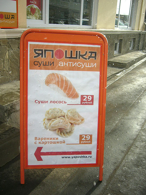 Известная в Москве сеть ресторанов «Япошка» в начале 2008 года поменяла вывеску. Теперь они называются «Япоша». Впрочем, изменения коснулись не только вывески, но и кухни. Японской кухней сейчас никого не удивишь, «Япоша» — не единственный ресторан и не первый на этом рынке. Возможно, поэтому меню было разделено на две части: суши и антисуши. Очень мудрое, на мой взгляд, решение. Не все любят японскую кухню (или, скажем, японскую кухню в том виде, в каком она присутствует в России). И если приходит в ресторан семья, где кто-то обожает суши, а кому-то с доплатой они не нужны, предпочитают что-нибудь из европейской кухни, пасту, например (новое поветрие — у нас они всю жизнь макаронами звались), или украинский борщ, или пельмени — выбор большой. К лету обещают, что в меню появится мясо на гриле и что-то еще из американской кухни. Что такое американская кухня — не знаю, до сих пор думала, что что-то из «Макдональдс» 🙂