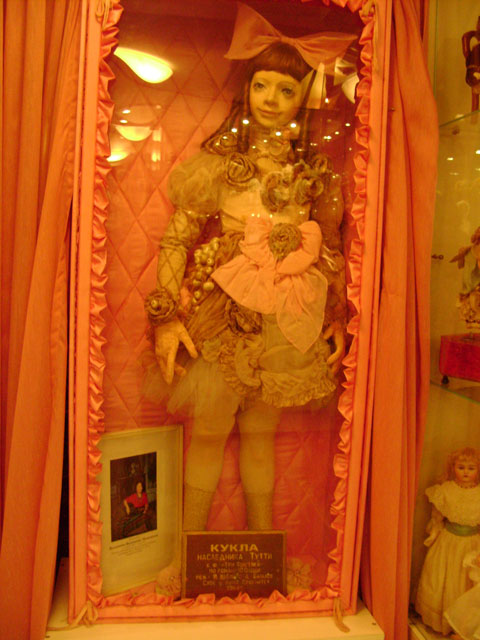 Куклы фарфоровые, деревянные, восковые, металлические. Самая известная кукла, можно сказать, кинозвезда. Все, наверное, смотрели фильм по сказке Ю. Олеши «Три толстяка». Вот кукла, которая «снималась» в кино, теперь находится в музее. Теперь с ней дети фотографируются. 🙂 Кстати, фотографироваться на фоне кукол разрешается, стоимость съемки — 70 рублей.